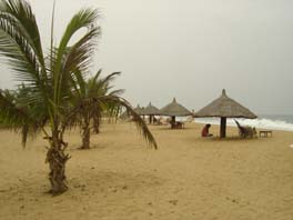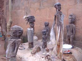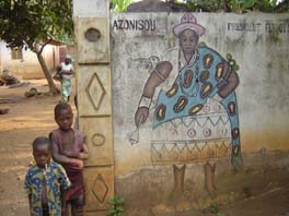 Left the palm-lined beaches and headed along the coast to Ouidah - Voodoo capital of Benin, with a history of slave-trading. The museum is fairly average but it gives you an idea of the linkes between Benin, Brazil and the Caribbean (Haita, Cuba) and the influence of Dahomeyan slaves on Brazilian culture. You can also see evidence of Brazilian culture in Benin, particularly in the architecture, which the repatriated slaves brought back to Africa. As for Voodoo (Fetishism), it was only officially recognised as a religion in 1996, and now they have a big festival every year, which starts with the sacrifice of a goat. We'd noticed that quite a few of the houses have white flags hanging outside, and apparently this denotes the house of a Voodoo priest. People go to them with a problem, the priest communicates with the spirits, and gives them a list of ingredients (such as parrot's tail or cobra's head). The buyer then takes the 'prescription' to the local Fetish market (basically like a Voodoo pharmacy) - and the priest creates a fetish imbued with the spirits' power ... or something like that. Anyway, outside the museum we were hounded by boys demanding money and generally a bit too cheeky, so we drove on to Abomey. Installed ourselves in the garden of Chez Monique - an okay overlanders' place with lots of trees and wooden sculptures.