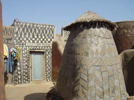 Thought we'd stop by a village called Tiebele, as there's an interesting sounding royal compound with traditionally decorated houses. However, when we arrived we were hounded by guides who just wouldn't leave us alone. We looked again in the guide and realised it's down as one of the country's 'highlights', so they obviously see their fair share of tourists here - but surely not enough to justify the amount of guides. You can't visit the compound on your own, so we picked a guide and set off. It's actually a fascinating place. The architecture of the houses is amazing and they're really cool inside (literally). There are about 300 people living in the compound - which means the chief must have an awful lot of wives. After our visit, we headed towards the border with Ghana. It was market day so the immigration/customs were rather busy and the town was packed with people and music blaring out. Drove through a town called Bongo and funnily enough there was a procession of people playing bongos. It was quite tricky finding somewhere to bush camp as there were little villages and houses everywhere.